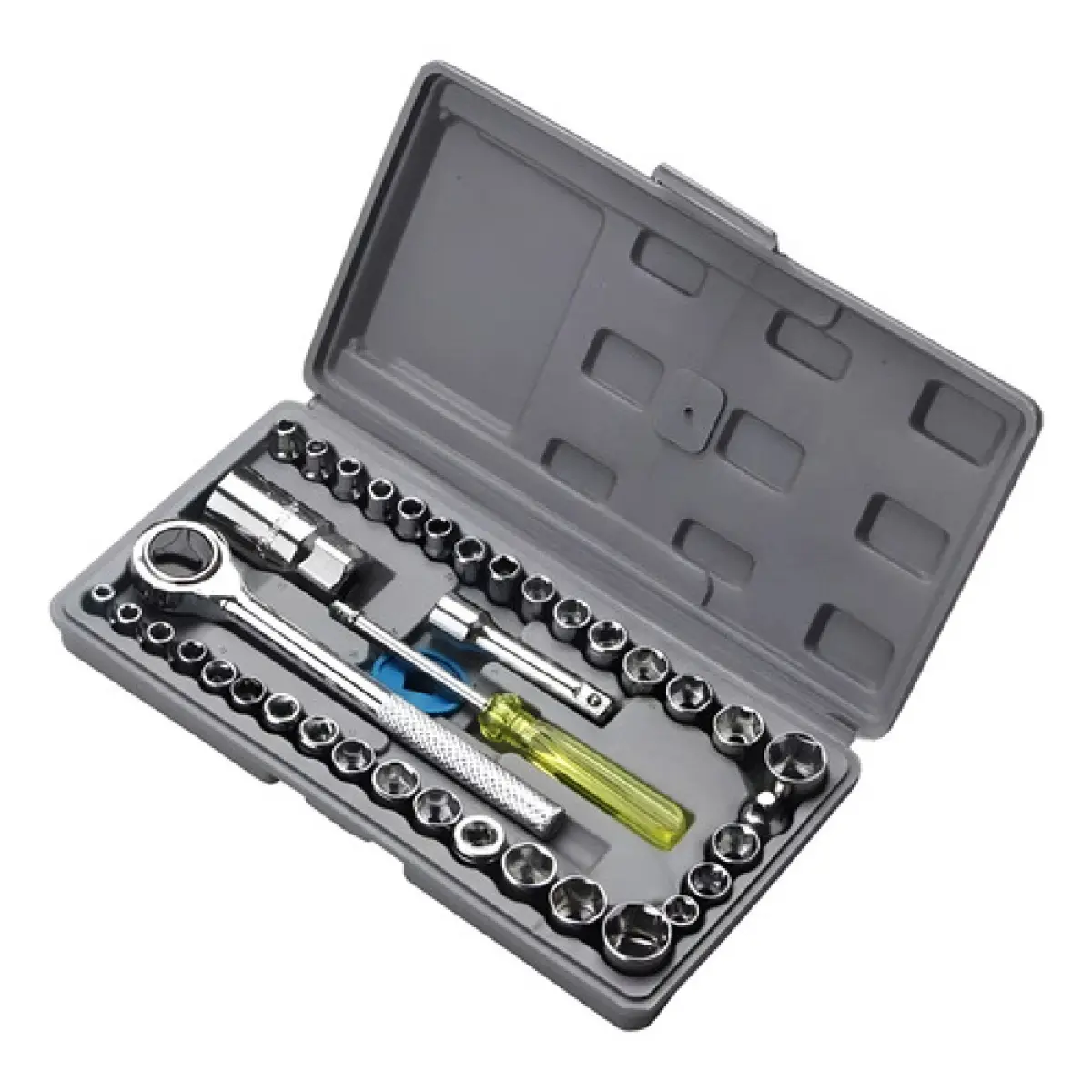 El Set de Llaves Tubo 40 Piezas es una herramienta imprescindible tanto para profesionales como aficionados. Incluye llave tubo, puntas, destornillador, criquet y llaves combinadas, todo organizado en un maletín compacto y resistente para mantener cada pieza en su lugar.